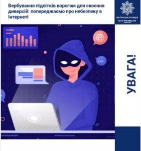 Російські спецслужби невпинно намагаються вербувати українських дітей. Ворог використовує соціальні мережі й месенджери, щоб маніпулювати підлітками, пропонуючи їм «легкий заробіток». Завдання можуть починатися начебто з невинних – наприклад, розклеювання листівок, – але згодом переростати в серйозні злочини.